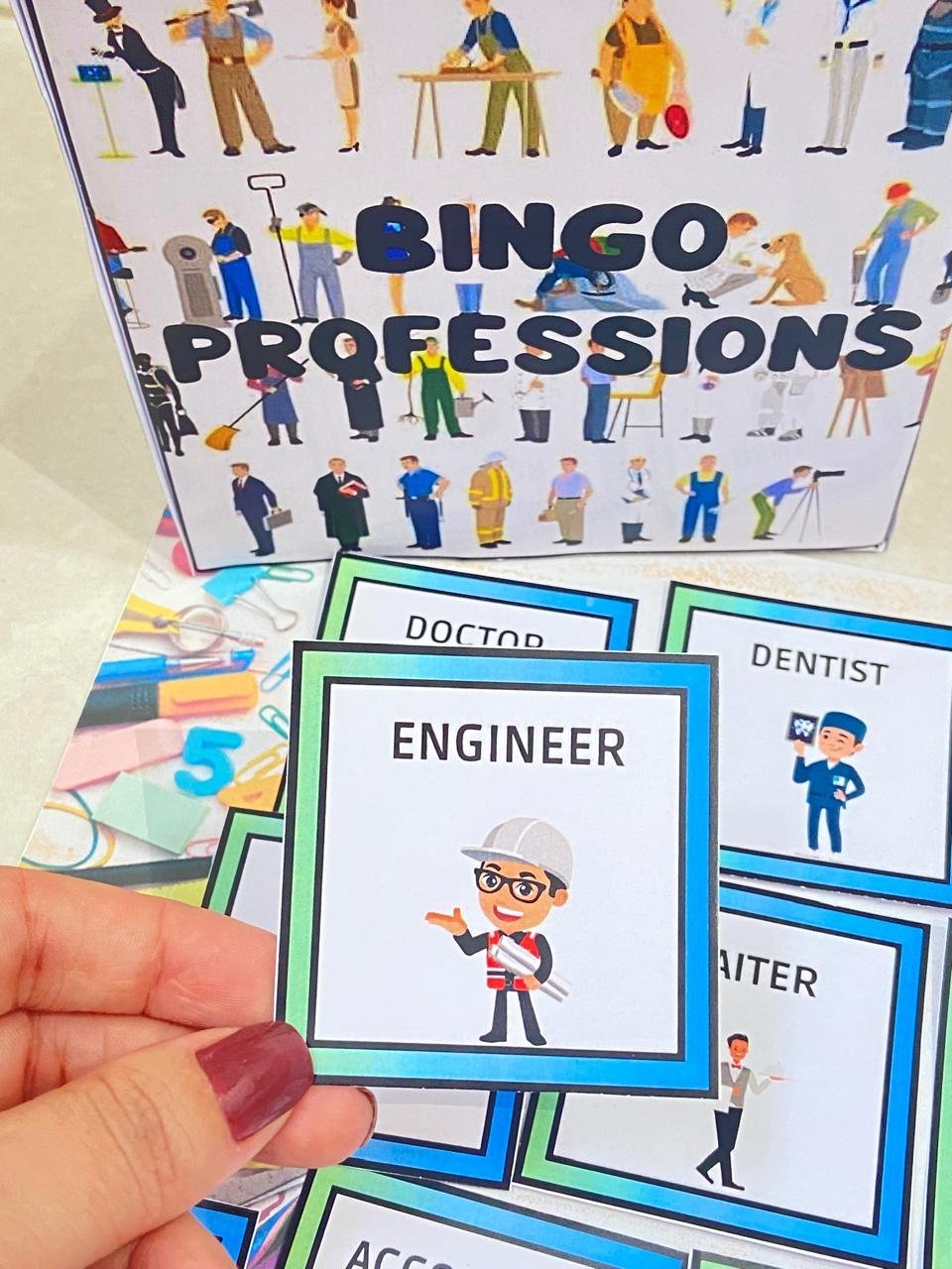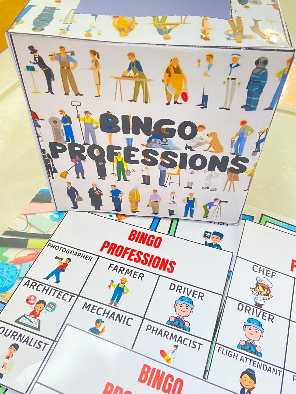 27 flashcards ilustrados com profissões em inglês para realizar o sorteio e também pode ser utilizado para Memory Game;