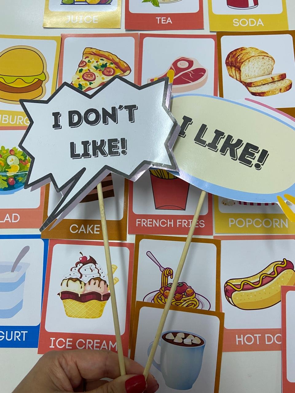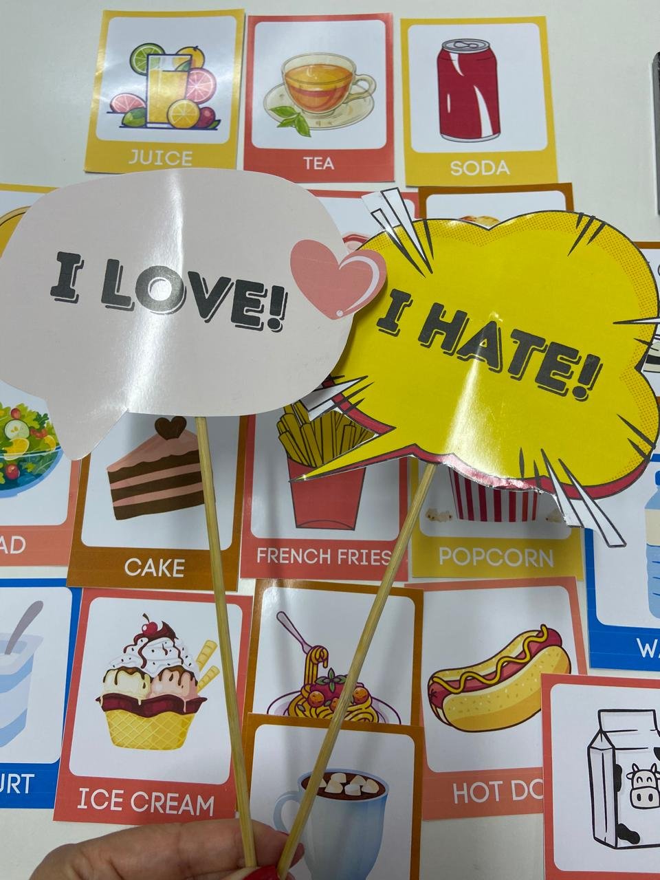 • Plaquinhas I like, I don´t like, I love, I hate para se referir aos alimentos;