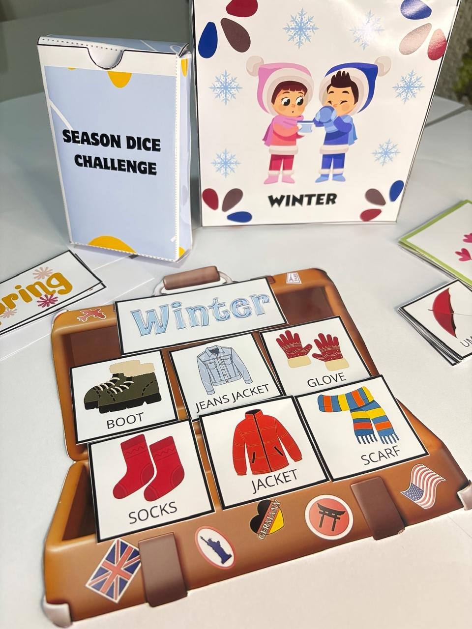 Atividade “What’s in my suitcase?” – com mala, 18 figuras para classificar e cards das estações