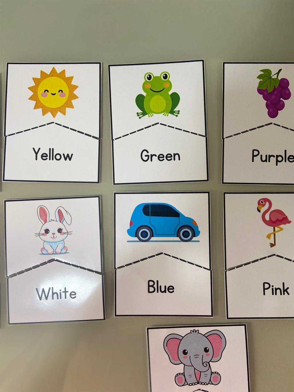 Eles precisam encontrar as peças que se encaixam corretamente, associando as cores ao nome em inglês.